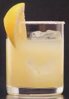 グラスの縁をレモンで濡らして塩のスノー・スタイルにし、レモンを飾る。