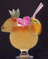 パイナップル、マラスキーノチェリー、レモン、ライム、ミントの葉、季節の花などを飾り、ストローを添える。